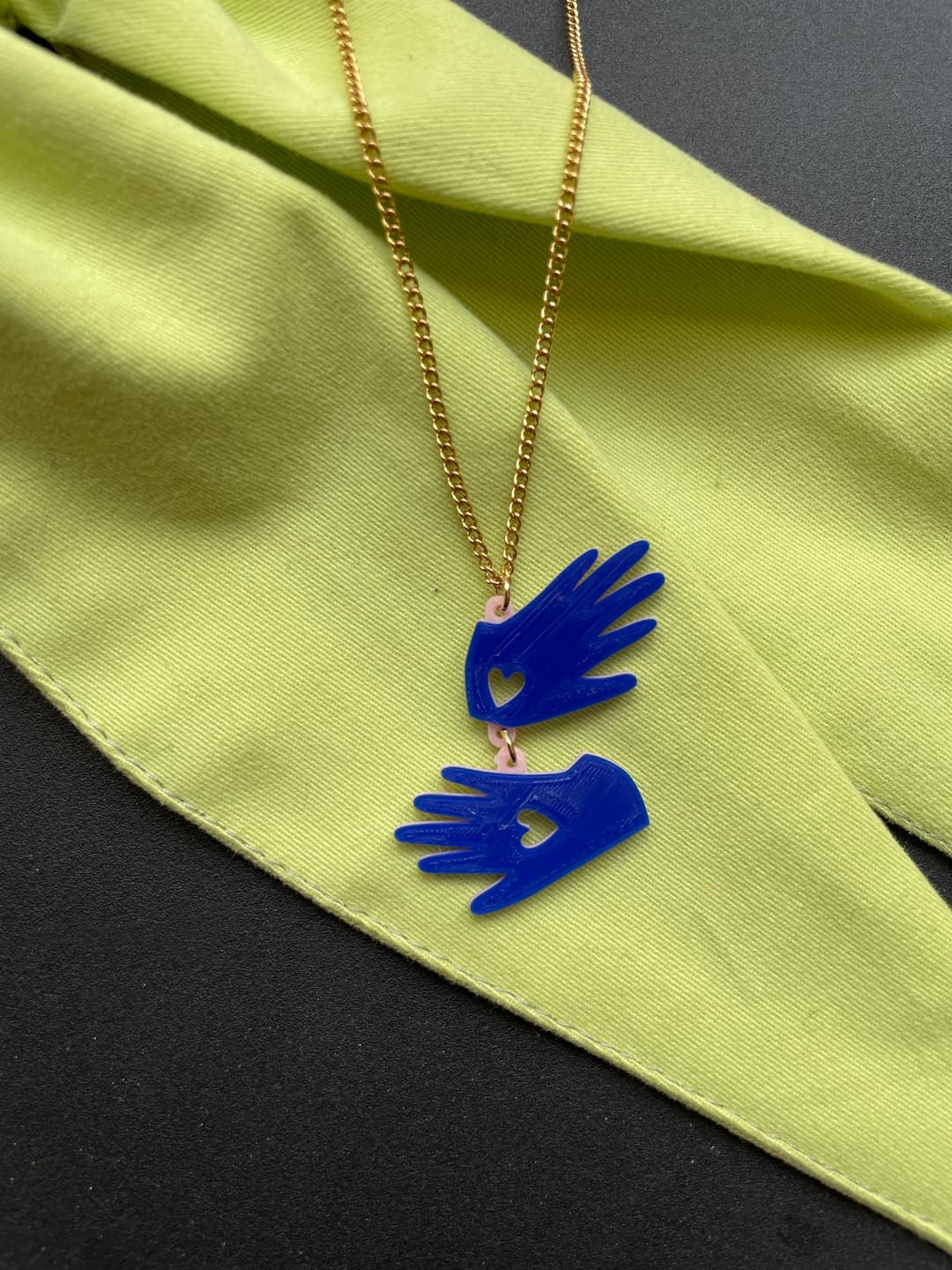 Pendentif imprimé en PLA, un biopolymère fait d’amidon. Chaîne et maillons en acier inoxydable. Chaque bijou est réalisé sur commande, selon votre choix de coloris, puis est entièrement monté par mes soins, dans mon atelier parisien.